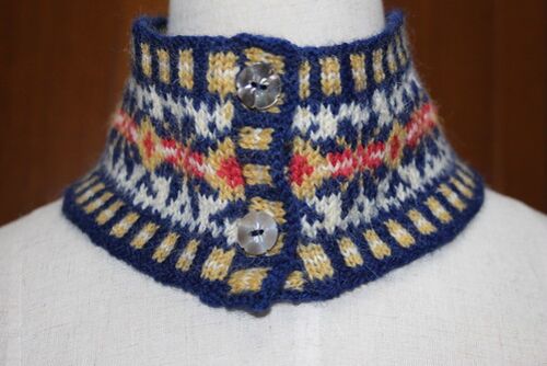 宿題のネックウォーマー 完成 こんな感じで 出来上がりです。リブの最後の仕上げがうまく出来ていないので見本のような角がうまく編めてません。こういう細かいところが難しい。 ともあれ スティークの経験が出来たので いつでも本番いける かも。ボタンは …